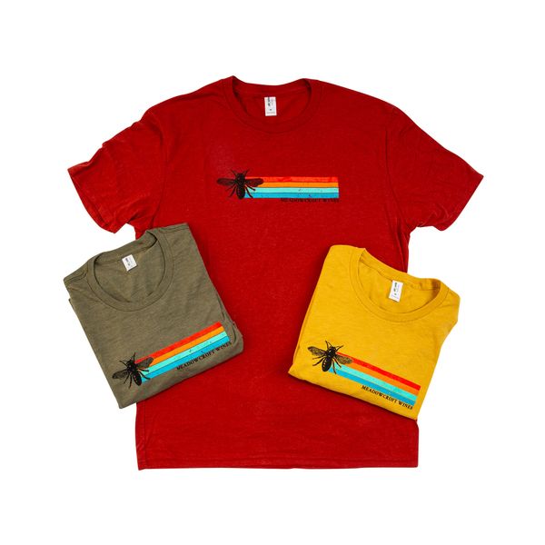 Show off your Meadowcroft pride in style with this soft, vintage-inspired logo tee. Featuring our signature bee and colorful retro stripe design, this unisex shirt combines comfort and charm—perfect for tasting room days, wine country adventures, or casual weekends. Available in red, olive, and gold.